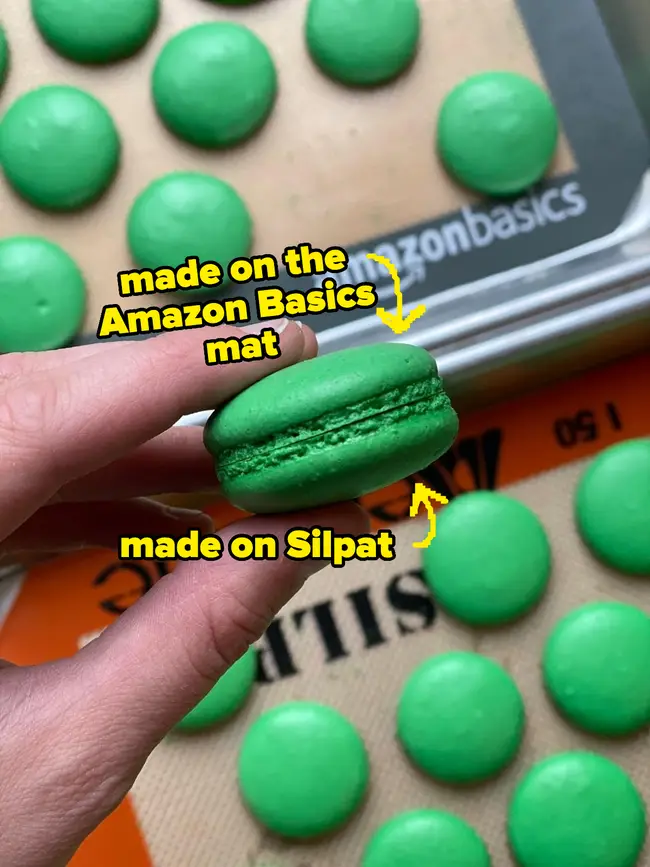 Promising review: “I am a macaron baker and have been using Silpat brand for years. I needed to order more Silpats, but didn’t want to spend the money. I found these Amazon Basic nonstick baking mats and thought I’d give them a try. It has been a month now, and they are still working just as great as my Silpat brand. Even baking is easy to clean and clear (I bake shapes and use templates underneath). Hopefully they last as long as my Silpats, which I have had for three years now, but if I get at least a couple of years out of them before buying new ones, I won’t mind because of the price! The top macaron shell [pictured above] is from the Amazon Basics brand, and the bottom is Silpat. They baked up even and with the same feet!” —Mac MKE
